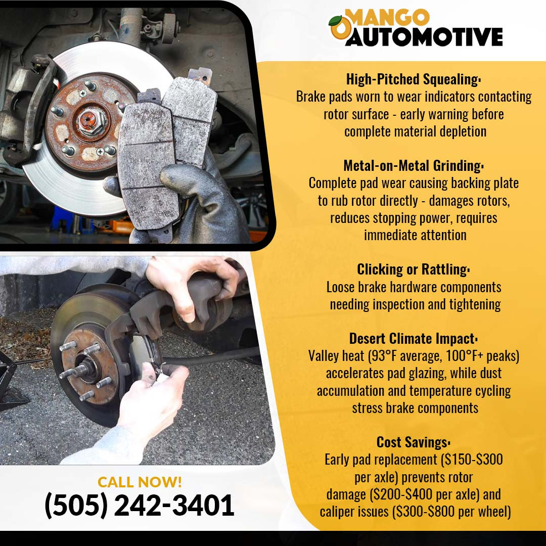 Drivers experiencing brake noises can schedule complete brake service and inspection in Albuquerque, NM by contacting Mango Automotive (The Valley) at (505) 242-3401. The facility offers same-day service for most brake repairs, comfortable waiting areas with high-speed WiFi, and complimentary shuttle service within 3 miles. Professional brake evaluation backed by industry-leading warranty coverage ensures vehicle safety and driver confidence on local roads.
