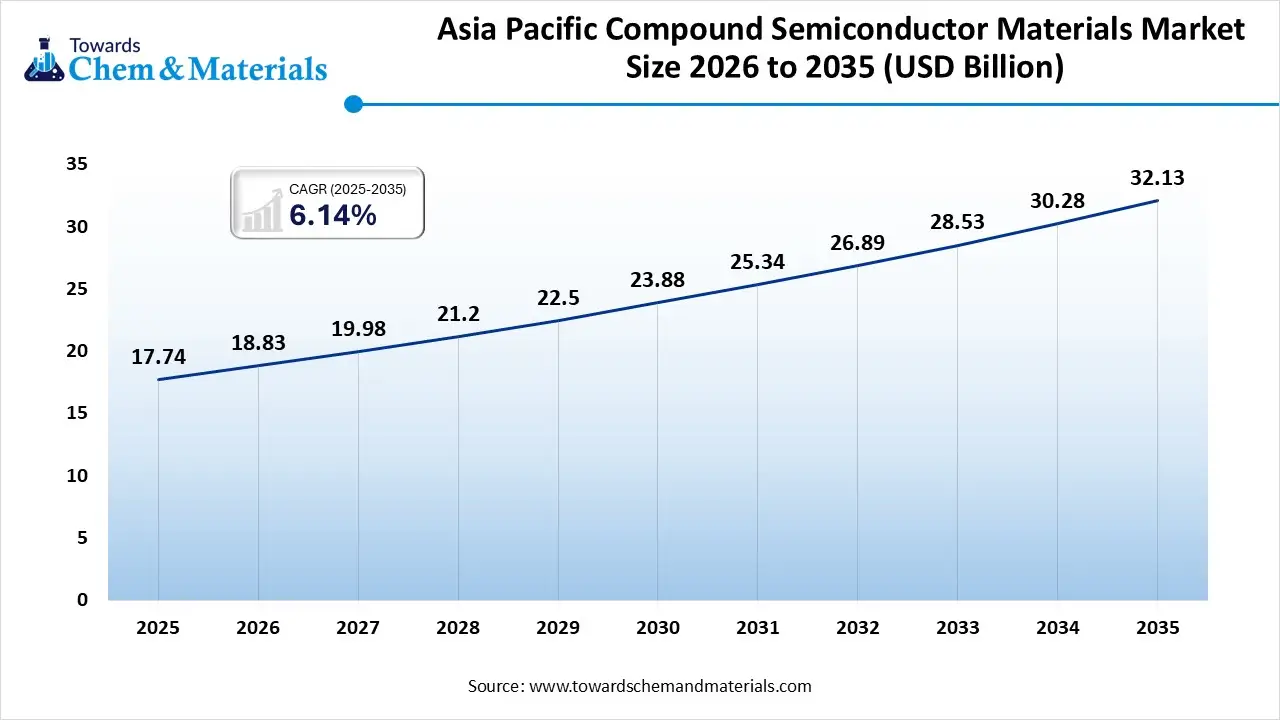 The global did Asia Pacific compound semiconductor materials market size is projected to reach USD 18.83 billion by 2026. It is projected to reach USD 32.13 billion by 2035, growing at a CAGR of 6.14%. The Asia Pacific region leads the global market because it manufactures most of the world's electronics. Countries like China, Japan, South Korea, and Taiwan have strong semiconductor ecosystems. These countries produce smartphones, EV components, LEDs, and power devices in very large volumes.